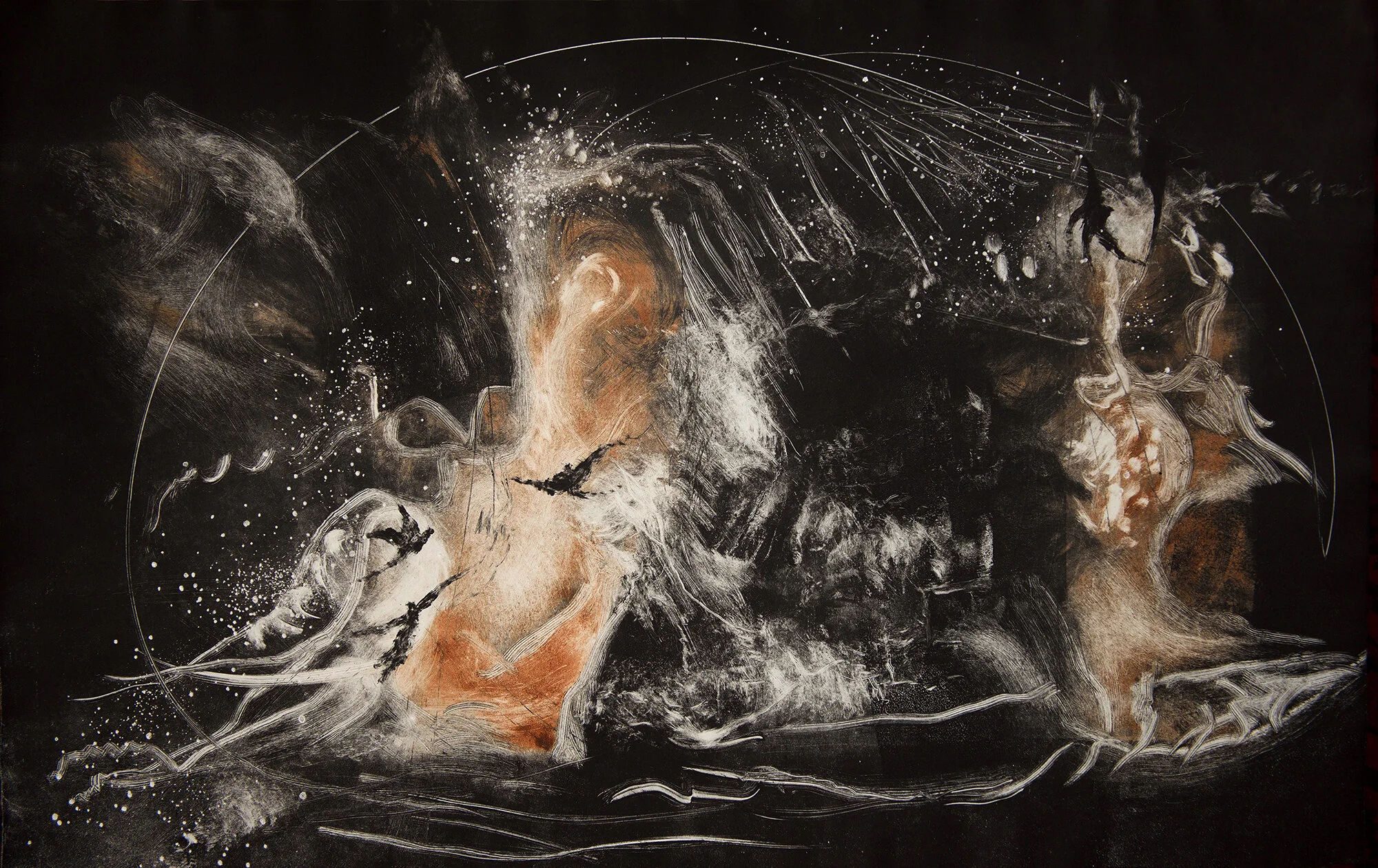 Elements in nature and the physical world that are absorbed at a particular time and place. This led to embarking on a voyage of the imagination involving a fusion of images, tonal planes, mark making, linear and textural qualities.
