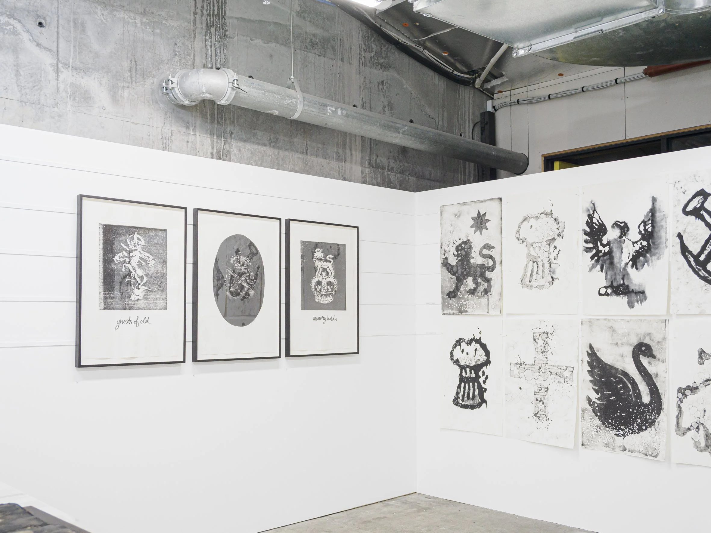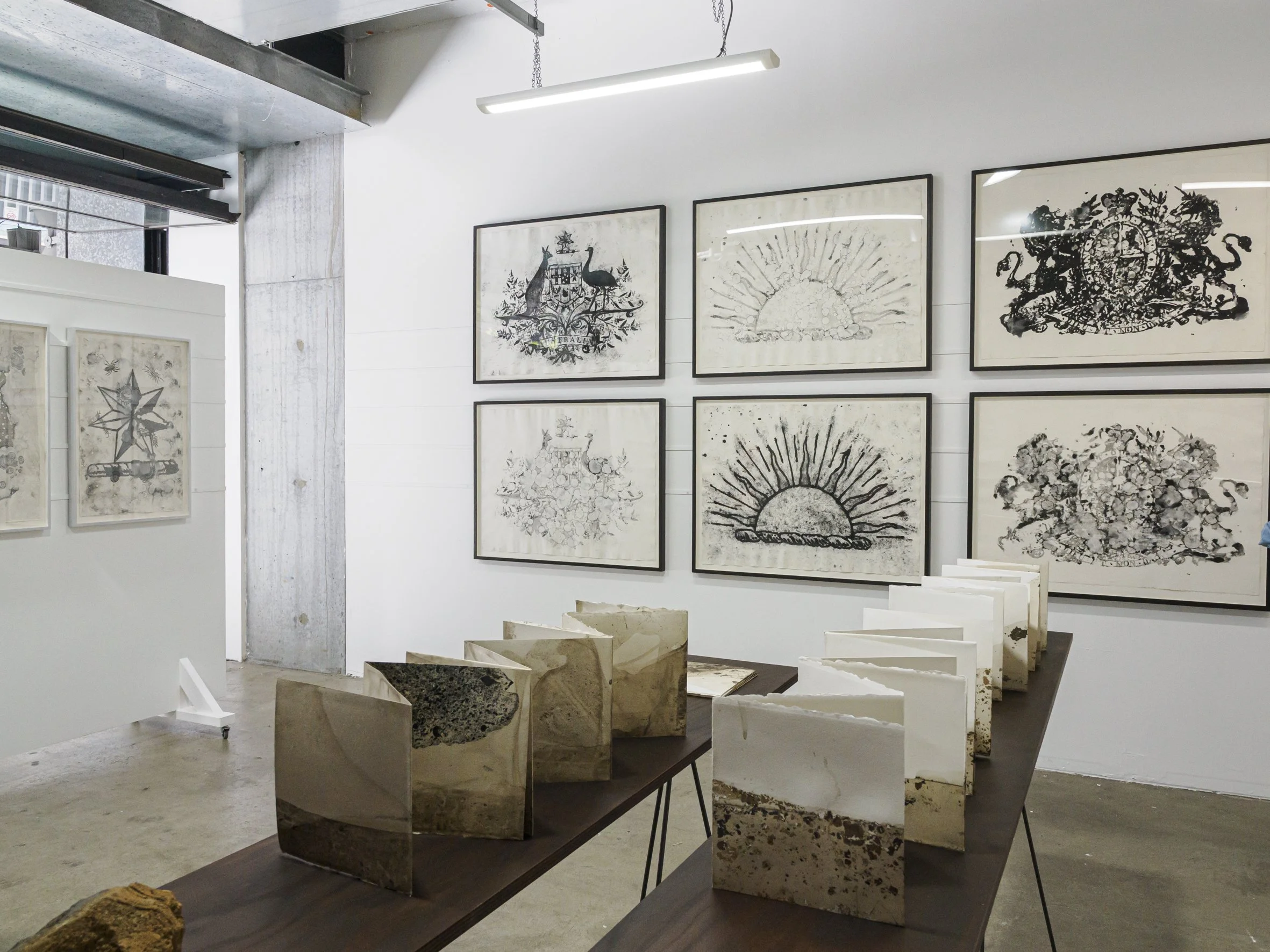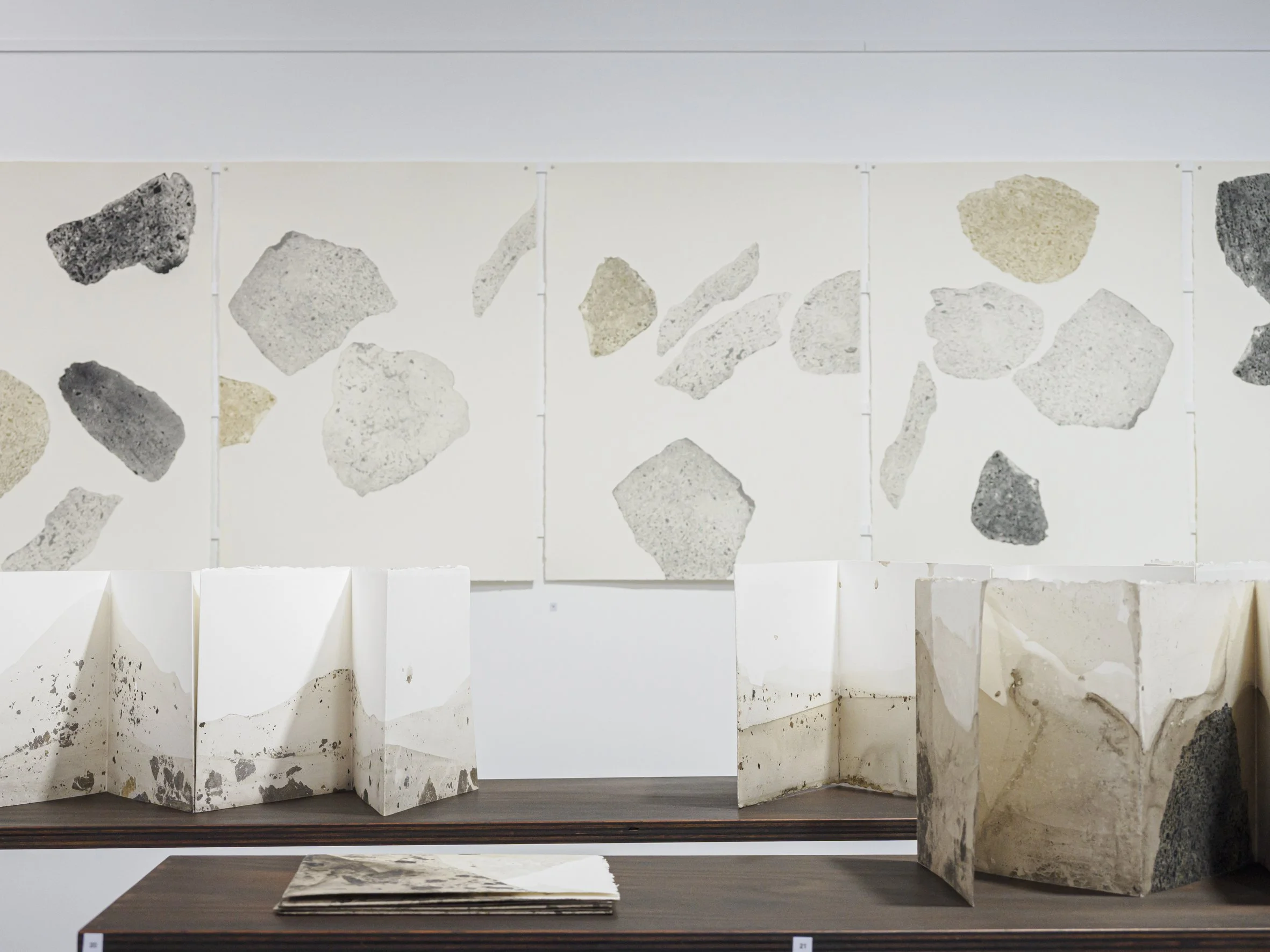 Foreground: Perdita Phillips, series of snake fold books, 2026, microbial film on Arches paper, each 22 x 174 cm, U/S. Background: Perdita Phillips, series of photogravure prints, 2026, intaglio on Somerset, 76 x 52 cm, U/S.